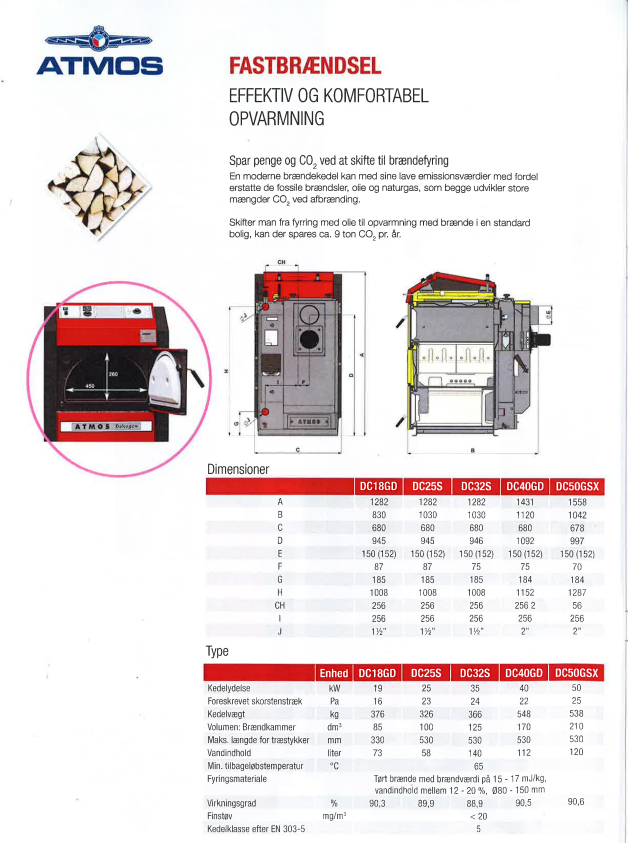 Robust og effektiv fastbrændselskedel til forbrænding af, op til 33 cm lange brændestykker, med særdeles høj virkningsgrad. Brændekedlen er en meget robust og gennemprøvet forgasningskedel med to brændkamre og røggassuger. Brændekedlens høje kvalitet og forbrænding i to faser giver mange års problemfri drift med en virkningsgrad på omkring 90 %. Brændekedlen er udstyret med et stort brændkammer, så antallet af påfyldninger er reduceret til et minimum. Ligeledes er konstruktionen udført, så der er nem adgang til rensning og rengøring. Alle kedler fra ATMOS lever op til forskrifterne for miljøvenlige produkter og er godkendt i henhold til Eco-Design.